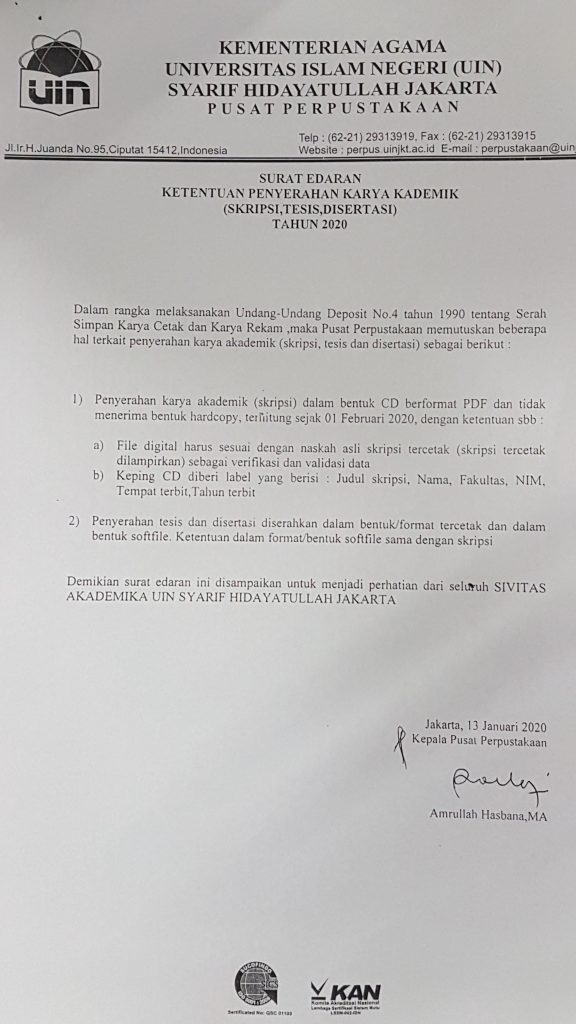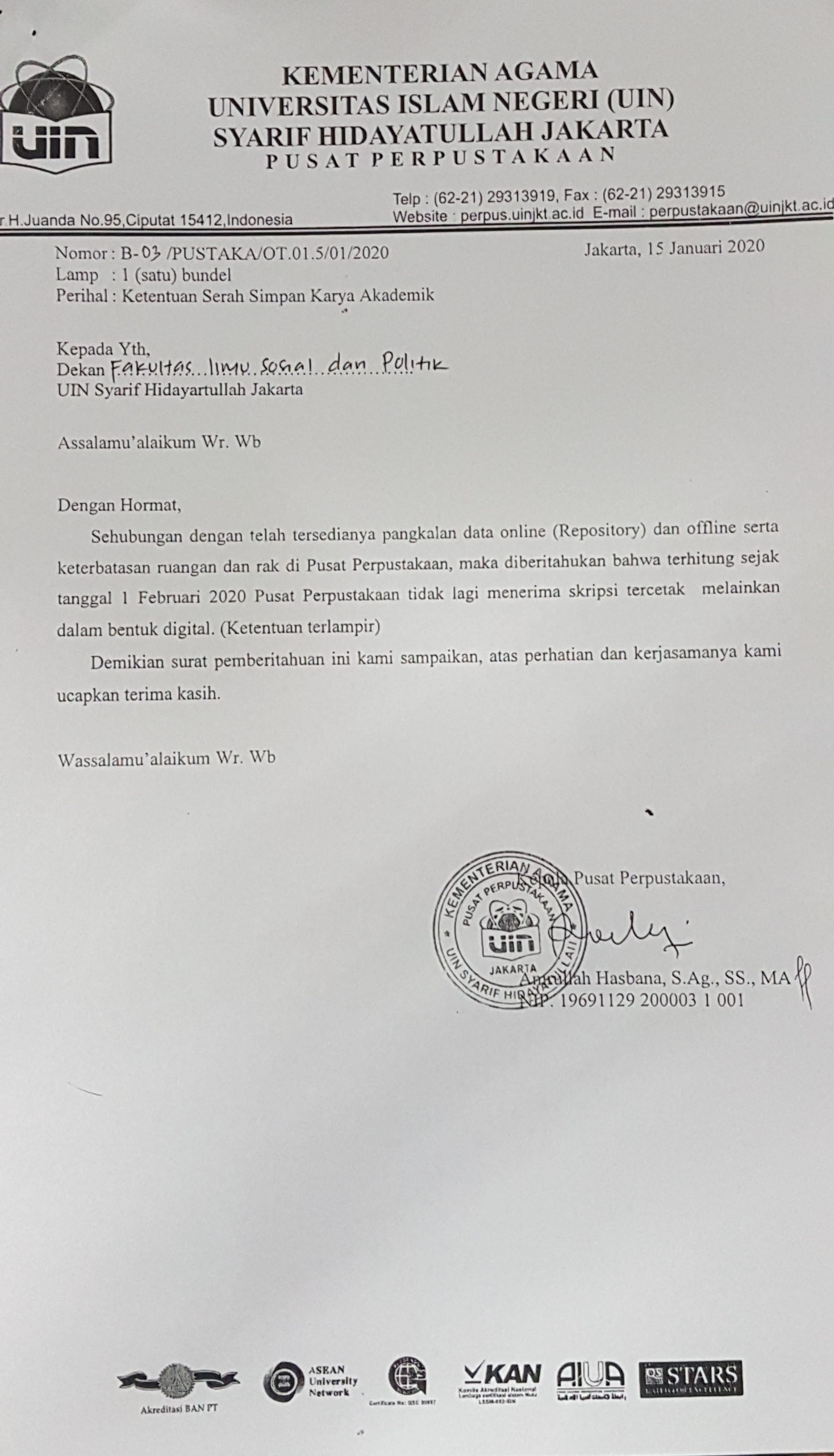 FISIP Daring, menindaklanjuti surat edaran dari Pusat Perpustakaan UIN Syarif Hidayatullah yang terkait penyerahan karya akademik (skripsi, tesis, dan disertasi) sebagai berikut: