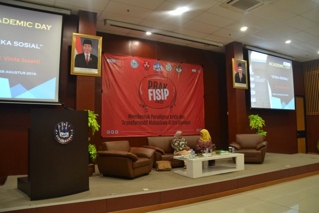 FISIP Daring. Fakultas Ilmu Sosial dan Ilmu Politik (FISIP) UIN Syarif Hidayatullah Jakarta pada hari Rabu, 28 Agustus 2019 mengadakan Seminar yang bertajuk “Etika Sosial”. Acara ini berlangsung pukul 13.00 – 15.00 WIB ditempat Auditorium FISIP. Seminar ini diadakan untuk pembekalan mahasiswa baru dalam menghadapi perkuliahan.