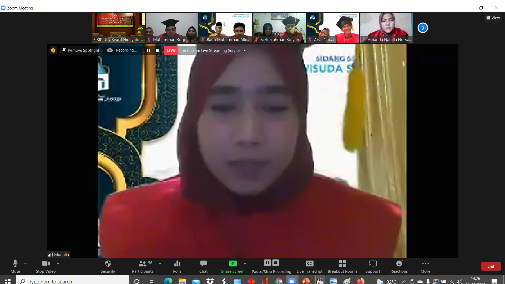 Munaliah sebagai wisudawan terbaik memberikan sambutan dalam yudisium ini. Ia mengucapkan terima kasih kepada orang tua, dan seluruh sivitas akademik FISIP UIN Jakarta yang sudah mensupport penuh untuk kuliah hingga akhirnya mendapatkan gelar sarjana. Ia juga menceritakan perjalanan panjangnya dalam meraih gelar akademik S1 dengan keterbatasan ekonomi tetapi ia terbantu karena mengikuti beasiswa.